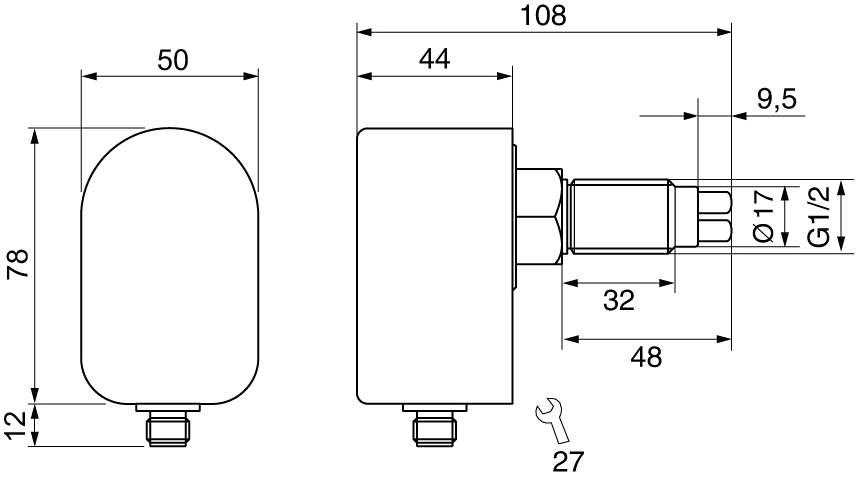 G1/2 – طول سنسور ۴۸ میلی‌متر – ۲۴ ولت DC – رله خروجی – سیستم دوشاخه M12